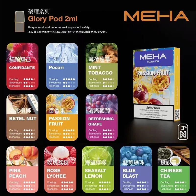 MEHA 煙彈採用高精度陶瓷霧化芯技術,密封防漏設計乾淨衛生,霧氣細膩順滑、口感純正還原度高。MEHA 煙彈提供22款口味選擇,3%濃度,完美兼容一代主機,層次豐富且持久,煙霧飽滿,回味悠長。一盒2ml*3顆入,每顆煙彈可提供約 550口,是追求穩定性能與高品質吸感用戶的理想之選。
